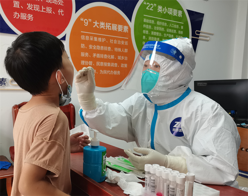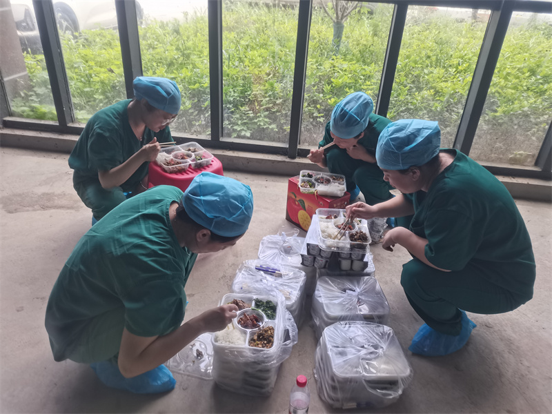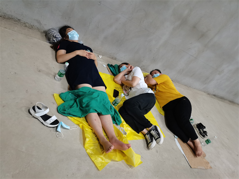 條件的簡陋,為采樣工作增加了難度。在炎熱的環(huán)境下,她們穿著密不透風的防護服,帶著N95口罩、面屏和多層手套,不停地為持續(xù)不斷到來的居民進行采樣。大到90多歲的老人,小到幾個月的嬰兒,一直戰(zhàn)斗到晚上11點多,在8個小時的時間里,憑著她們麻利地操作和熟練的技術,共為4000人完成了核酸采樣。采樣結束后,有的姐妹累得撐不住了,脫了防護服,顧不得雨天地面的潮濕,直接躺在了生硬的水泥地上。