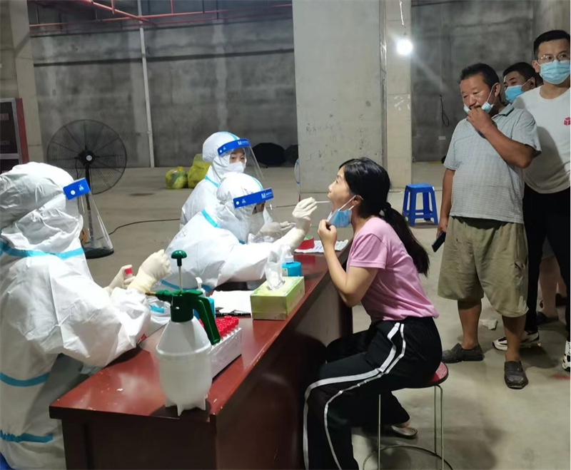 8月1日,在35℃的高溫下,需要入戶為行動不便、分散在各個村莊的居民進行采樣,鄉(xiāng)間道路狹窄,無法車接車送,只能步行前往。穿著多層的防護服,在烈日下奔波,悶熱的程度難以想象。有的姐妹恰巧處于特殊生理期,悶熱加上勞累,身體幾乎要虛脫了,仍然堅強地奮戰(zhàn)在前面,堅決不退場,圓滿完成了采樣任務。由于穿著防護服,每次至少要連續(xù)工作4個小時以上,為了避免上廁所的麻煩,她們不敢喝水,在炎熱的天氣里只能忍受著饑渴。