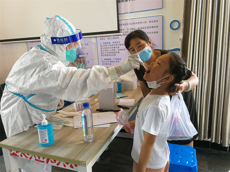 下午4點多,她們乘坐大巴經過10個多小時的顛簸后,到達南京江寧區(qū)淳化街道橫嶺社區(qū)后,顧不上休息,立即投入了戰(zhàn)斗。采樣點設在一座毛坯房里,條件非常簡陋,沒有水可洗手,降溫的電器只有兩臺電風扇。洗手間在千米之外的簡易流動廁所,來回需要20分鐘,為了節(jié)省時間,她們都是騎著電動車去方便。