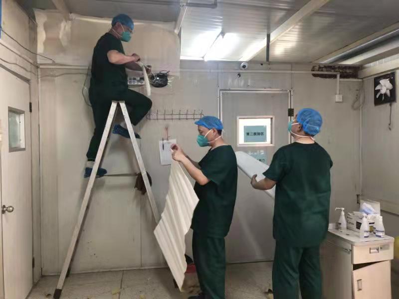 院領(lǐng)導(dǎo)班子深入“污染區(qū)”一線,經(jīng)過現(xiàn)場勘查,克服疫情期間物資缺乏、沒有施工人員的困難,制定了用現(xiàn)成材料低成本施工的方案,工會主席高磊同志和信息科李峰科長一起帶領(lǐng)大家在污染區(qū)內(nèi)爭分奪秒現(xiàn)場進(jìn)行整改落實(shí)。歷時兩天保質(zhì)保量完成了施工任務(wù),有力保障了醫(yī)院的平穩(wěn)安全運(yùn)營。