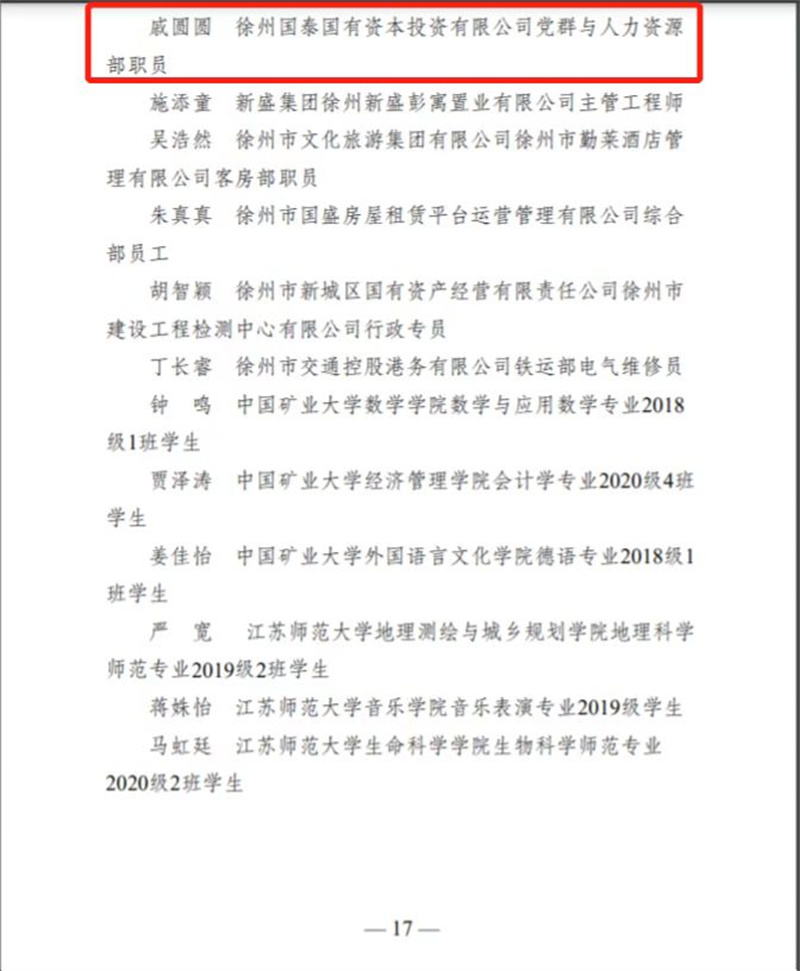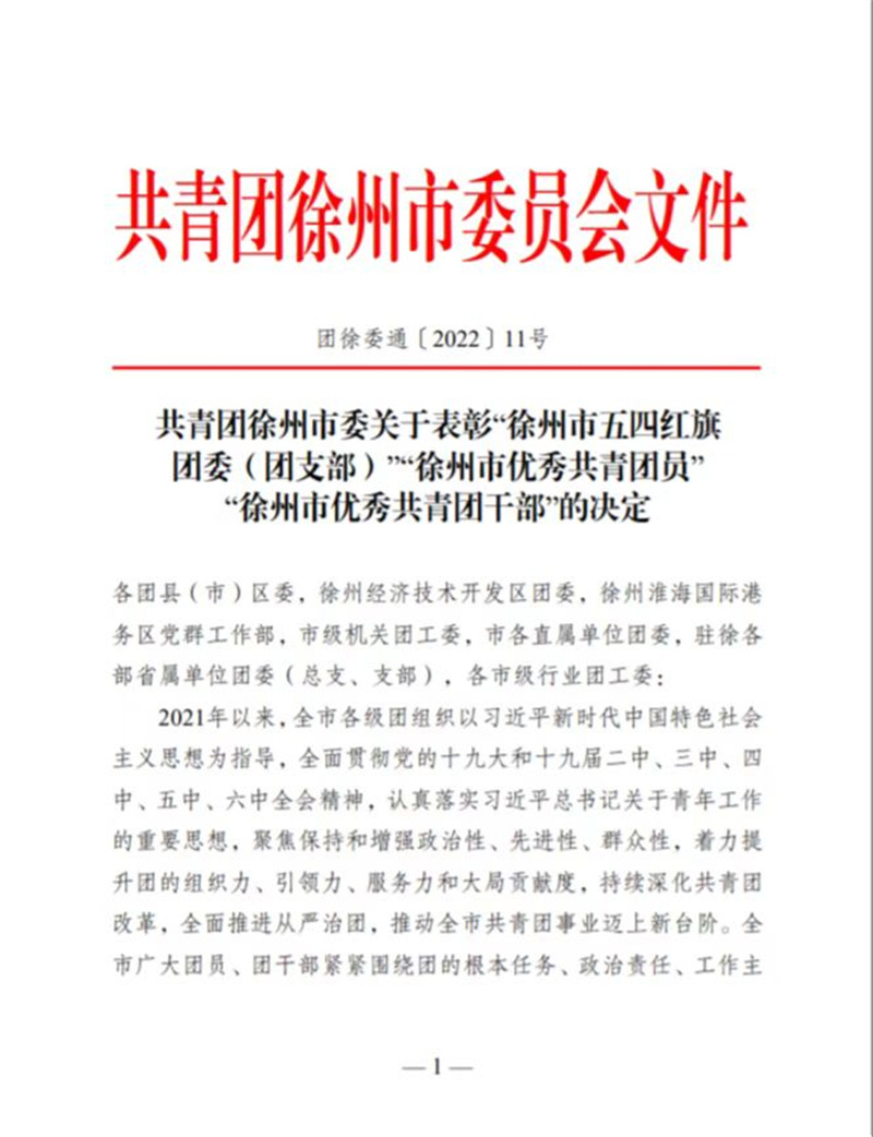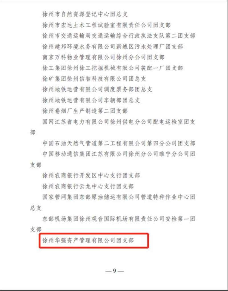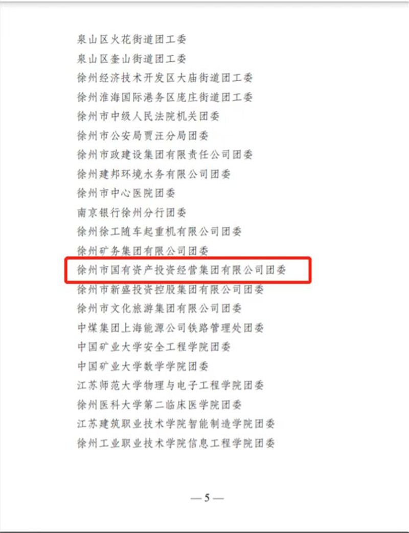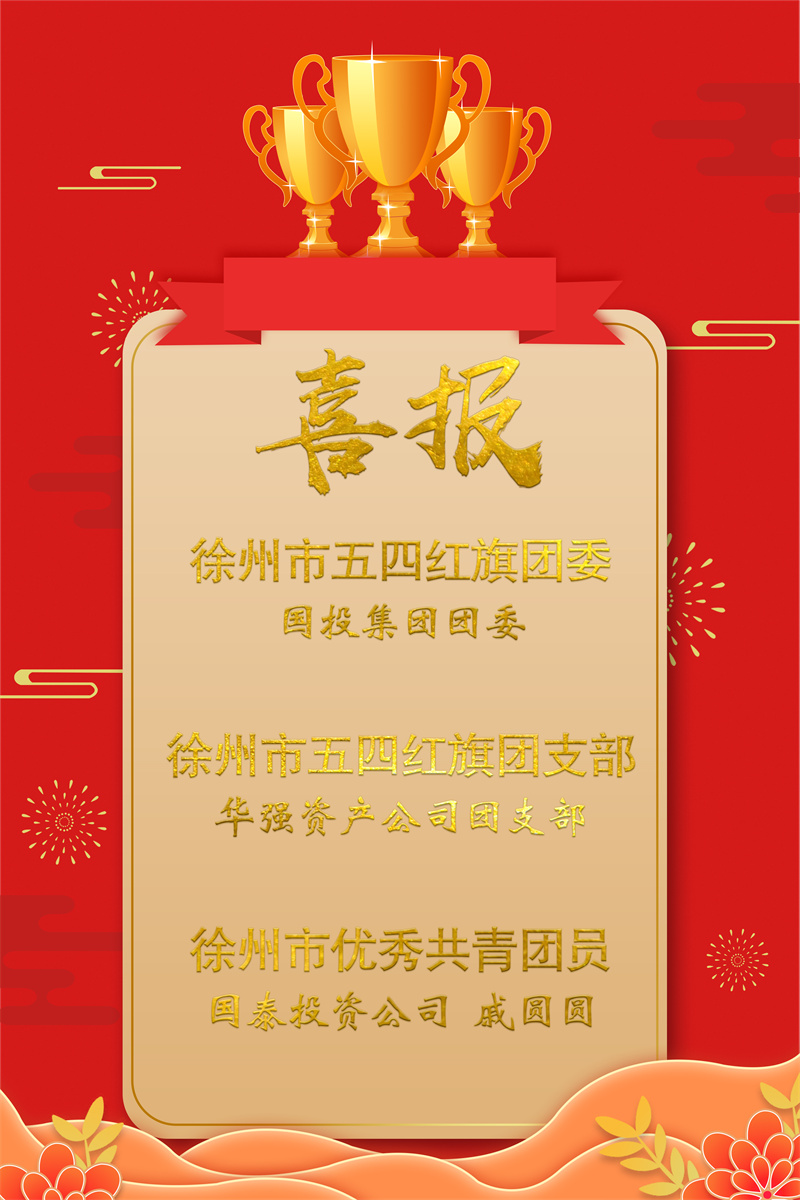2022年是黨的二十大召開(kāi)之年,也是中國(guó)共青團(tuán)成立100周年。近日,共青團(tuán)徐州市委對(duì)各級(jí)團(tuán)組織及個(gè)人作出表彰。其中,國(guó)投集團(tuán)團(tuán)委榮獲“五四紅旗團(tuán)委”稱(chēng)號(hào)、華強(qiáng)資產(chǎn)公司團(tuán)支部榮獲“五四紅旗團(tuán)支部”稱(chēng)號(hào),國(guó)泰投資公司戚圓圓同志榮獲“優(yōu)秀共青團(tuán)員”稱(chēng)號(hào)。