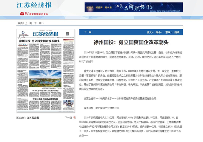15.10月17日,《徐州國(guó)投:勇立國(guó)資國(guó)企改革潮頭》登上《江蘇經(jīng)濟(jì)報(bào)》,并被人民日?qǐng)?bào)網(wǎng)、今日頭條、新浪網(wǎng)等20余家媒體轉(zhuǎn)載,有力提升了集團(tuán)公司的影響力和知名度。